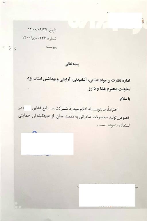 ۴- نامه رسمی شرکت تولید کننده در خصوص اظهار عدم استفاده از ارز حمایتی جهت تولید محصولات مورد تقاضا جهت صادرات